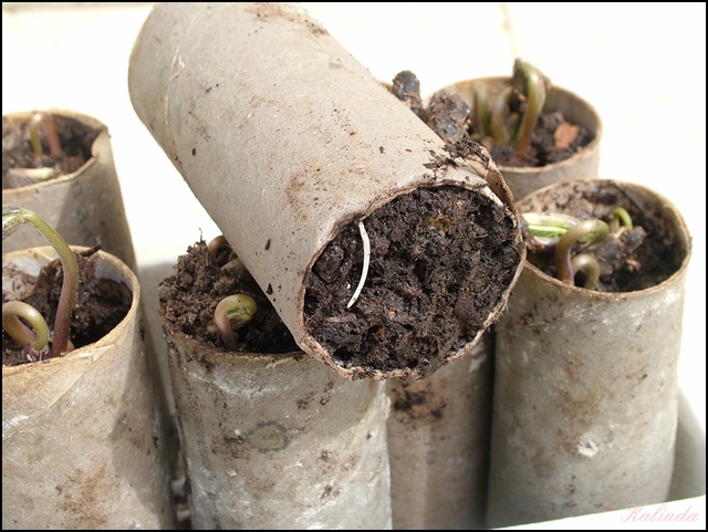 Les racines sortent des rouleaux (de papier toilette) après environ une semaine.
