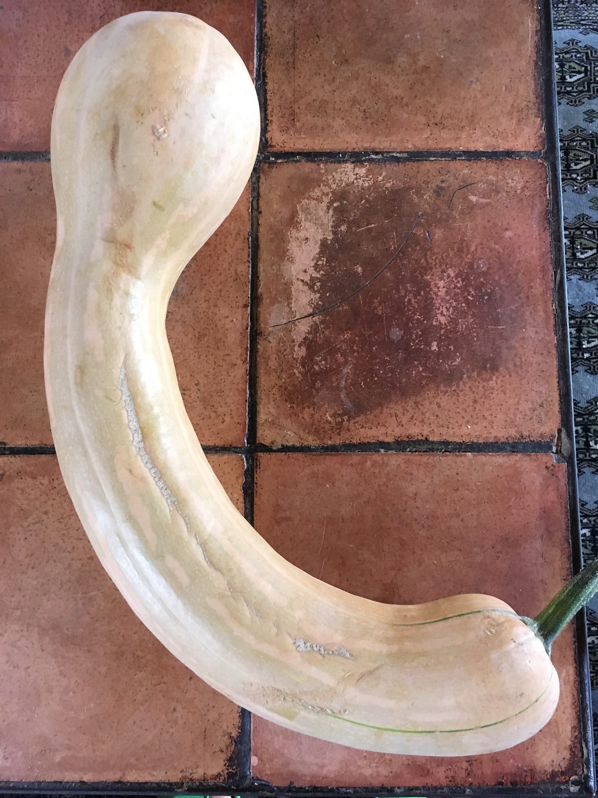 La courge longue de Nice est verte au début mais vire au jaune/beige après.