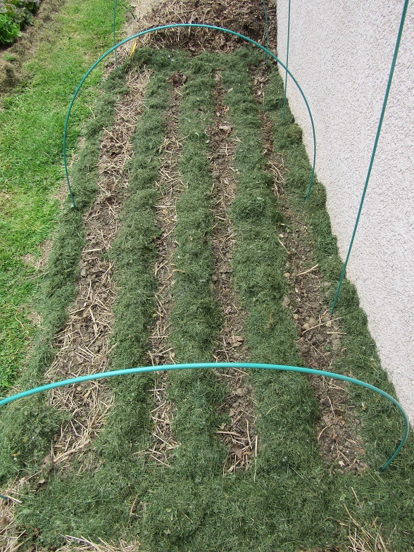 ) et déposé ces tontes entre les rangs de haricots et aux pieds des courgettes.