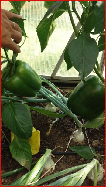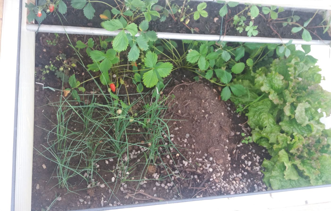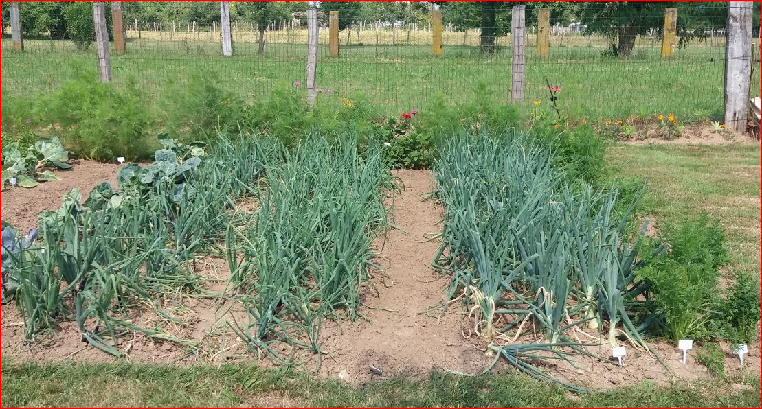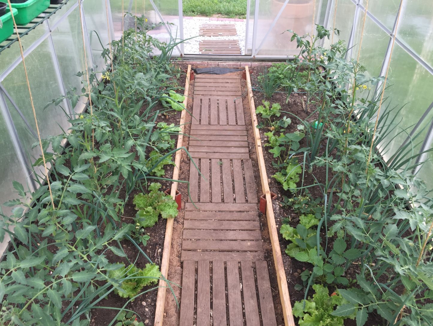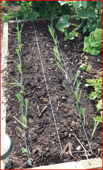 Les oignons de mai entourent les pieds de tomates et a l'avant des fraisiers et salades.