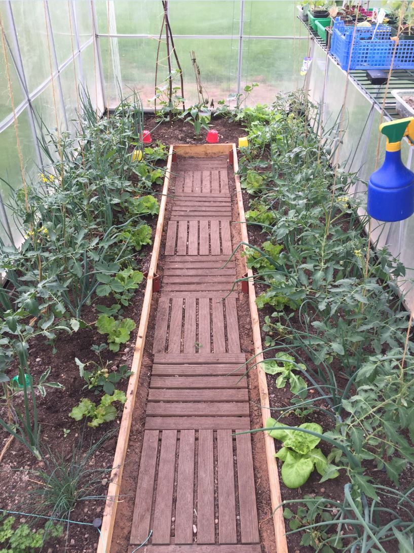 On a aussi installé un arrosage "automatique" dans la serre, bon faut encore qu'on allume et qu'on coupe l'eau mais ça arrose tout seul au pied.