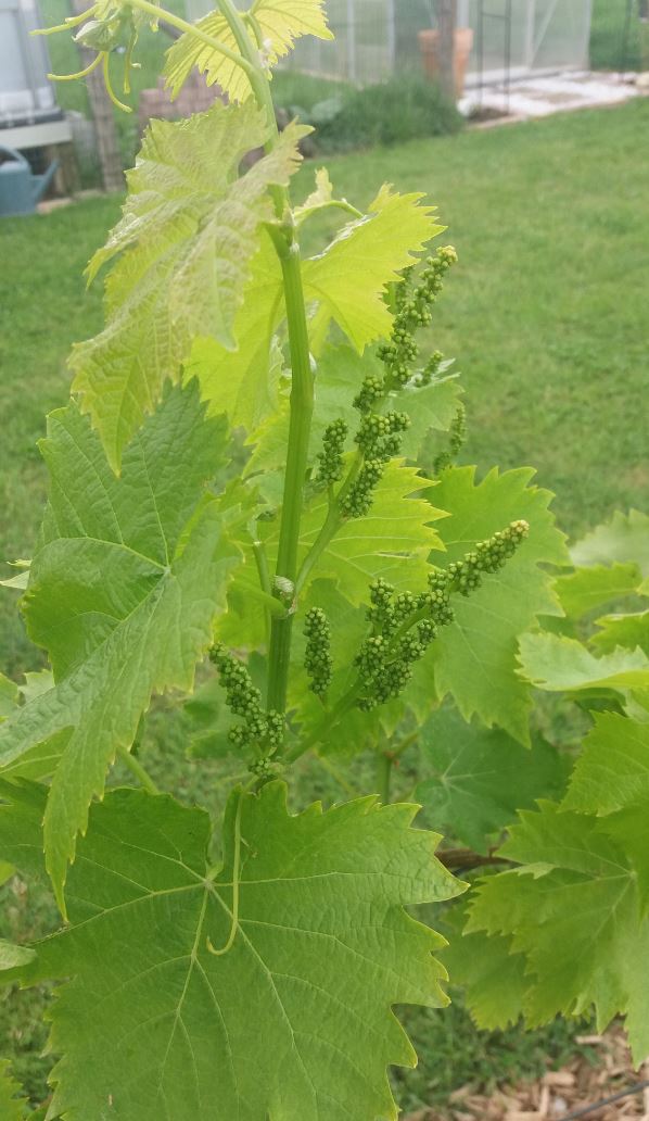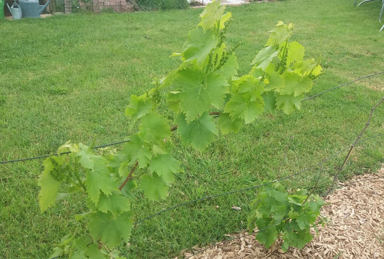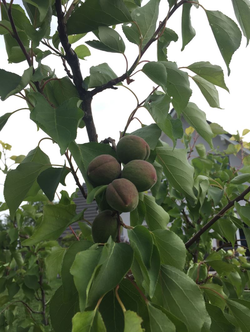 un tentative de petits pois.... mon semis de poireau et mon joli lustre avec au pied des concombres d'un coté et des céleris branche de l'autre. Coté fruitiers ils sont assez bien garni aussi, voilà une jolie branche d'abricots, mais les pommes, pêches et cerises sont pareil Et les vignes ont doit avoir 8 pieds je crois PLeins de grappes prometteuses, j'espère qu'on pourra les gouter avant les oiseaux...