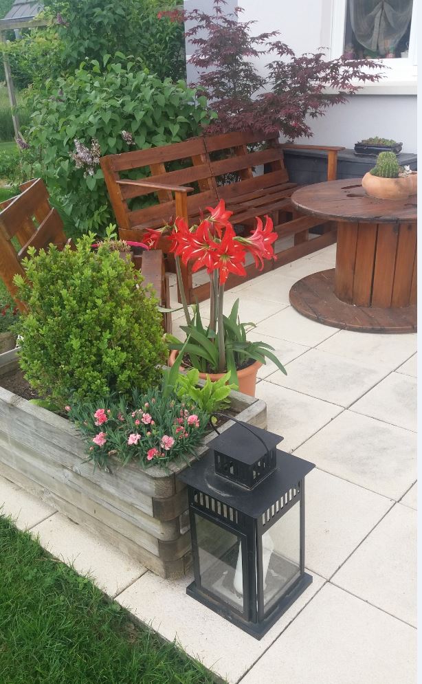 la pivoine une jolie tasse et une gerbera (j'adore ces fleurs!!!) l'amaryllis et mon entrée, faut couper les fleurs d'ailleurs...