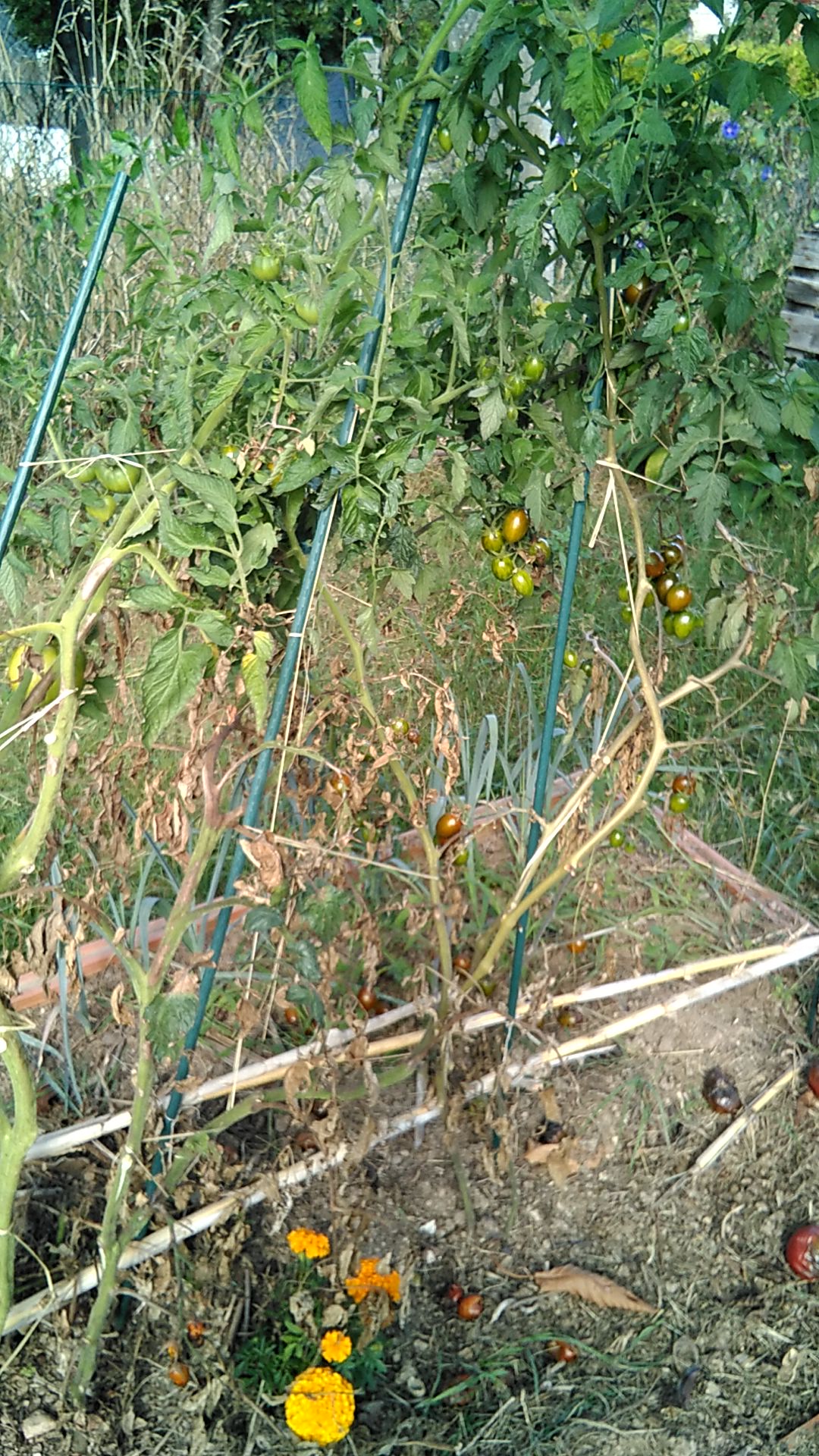 Pour les tomates c'est normal à cette période que les feuilles du bas se dessèchent . Le toupet du haut est bien vert et peut encore produire.