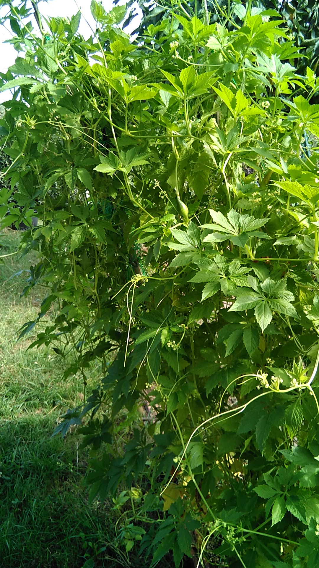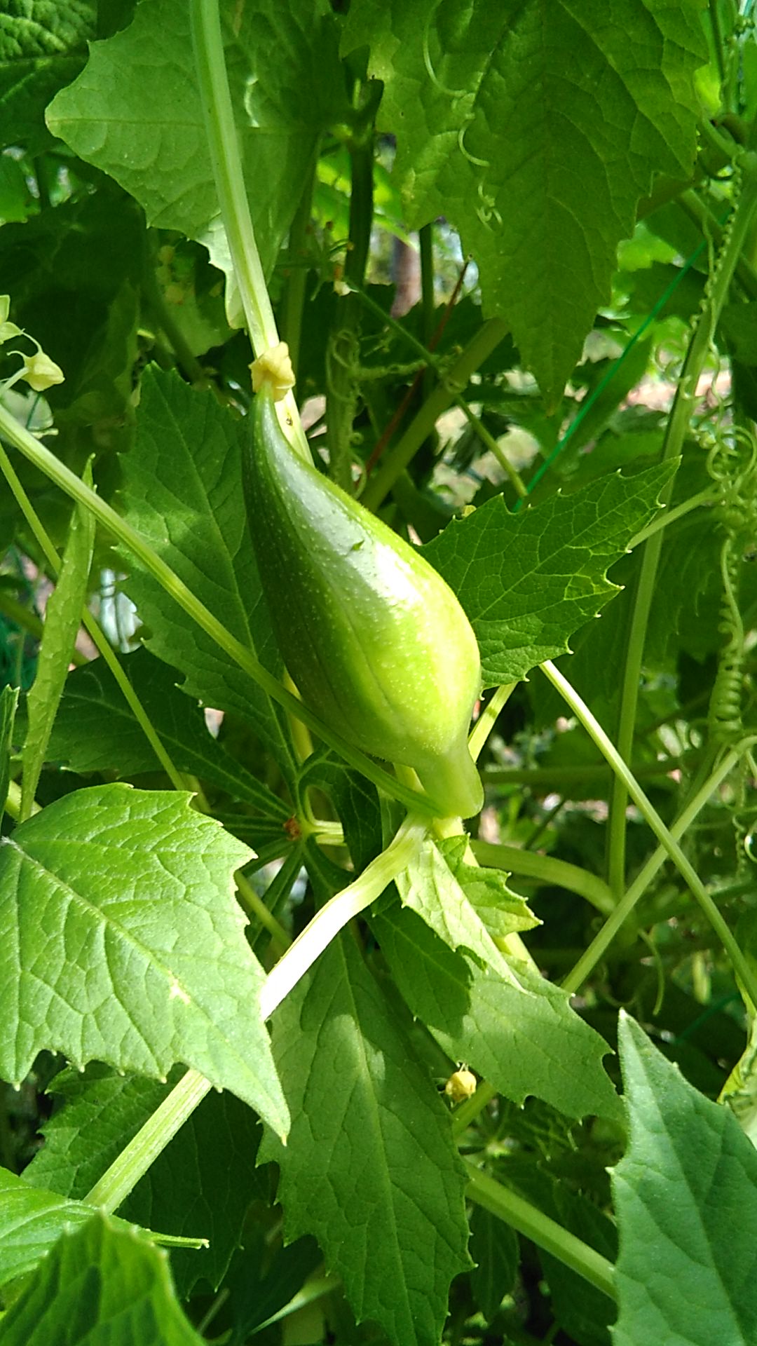 Les tomates ont bien poussé, a part une, mais a mon habitude, je n'ai pas mis le nom, et je ne suis pas sûre de qui elle est... Le cyclanthere prend ses aises et fait quelques mini fleurs... On attend... Les poivrons plantes par mon mari commencent a grossir