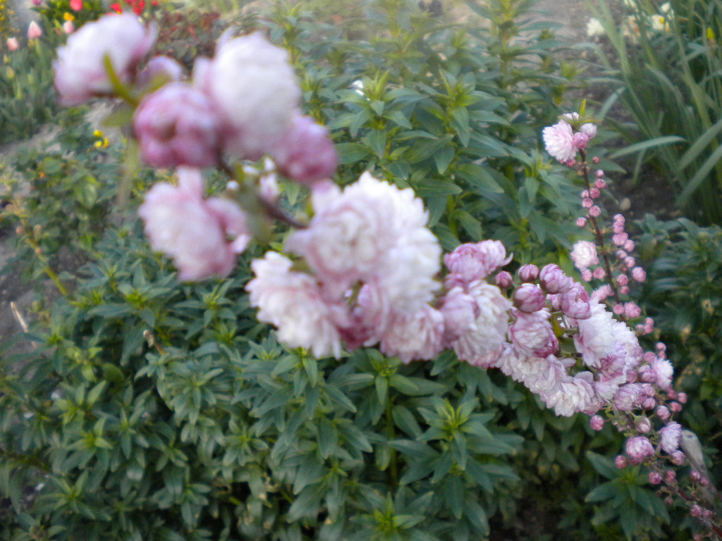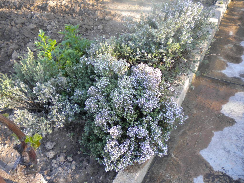 Une bordure de je ne sais quoi + ostéopernum, des petits oeillets,Spirée + bank jaune + prunus padus ,un petit clémentinier , un immence bank blanc une touffe de thym en fleurs mais les couleurs ne sont pas ressorties mais c'est une ruche il faut voir les abeilles qu'il y a dedans.
