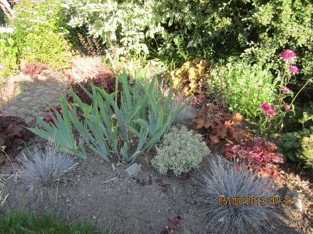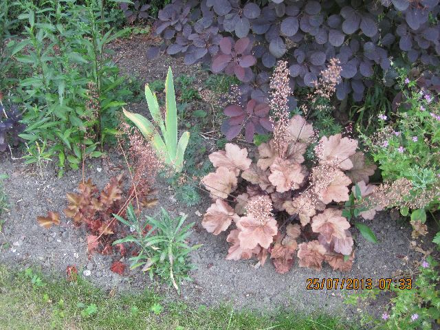 Mon massif manque pour l'instant de relief. Pour rajouter des verticales j'ai vu que les graminées se mariaient bien avec les heuchères. Pour cette année je laisse pousser, je verrai plus tard.