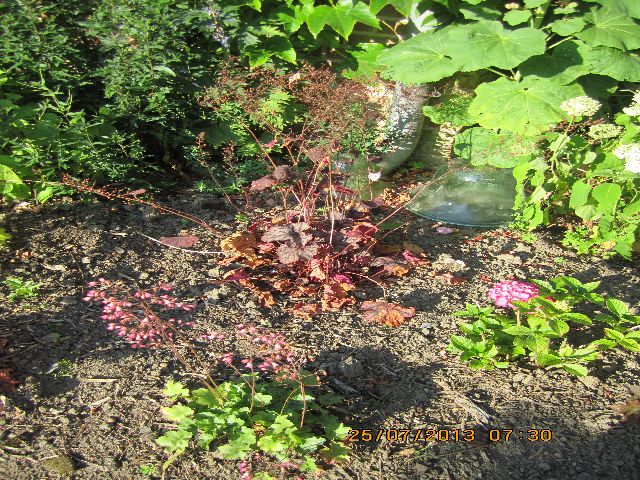 Mon massif de "plantes d'ombre" est récent et je débute dans ce domaine donc çà fait un peu artificiel, mais çà va s'étoffer et je vais progresser. Il est semi ombragé grâce aux chênes à proximité et principalement par une branche basse qui surplombe le massif. Habitant dans la campagne, les services municipaux passent régulièrement pour couper l'herbe sur le bord des routes et je m'empresse le soir venu de récupérer ce foin que j'étale ensuite au pied de mes plantes. Avantages : garde l'humidité, empêche l'herbe de pousser, la terre reste meuble car pas tassée avec les pluies, l'herbe en se décomposant nourrit les plantes.