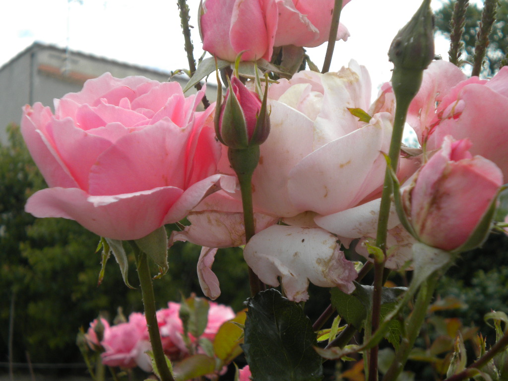 Et là voici enfin mes " Queen Elizabeth roses " , elles sont presque plus hautes que moi, un seringat simple qui s'est payé le luxe d'arriver presque sur ma table de la terrasse , jamais je ne l'avais vu comme ça . Aussi un très vieux rosier à bouquets il est fleuri presque tout le temps . Je crois me rappeler que c'est un " Royal chrysler "Je ne sais pas si l'orthographe est bon ...