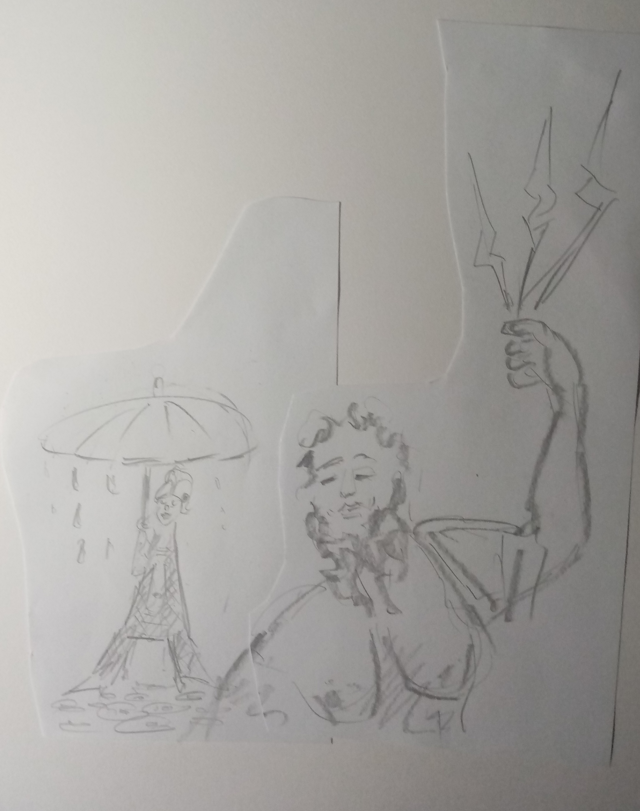 Deux croquis, le second , une intention, où quelque déesse des arts et de l'architecture, entre équerre et crayon, haranguerait les hussards de la République...