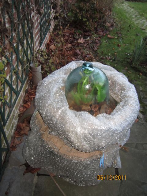 Bonjour Mamiris, Ah oui le voilà bien protégé ton arum sous sa cloche. Mais il aurai fallu la surelevé un peu afin que l'air y circule et éviter qu'une condensation se forme à l'intérieur de la cloche. Cela t'éviterai aussi le tracas de l'enlever leur des jours de beau temps.