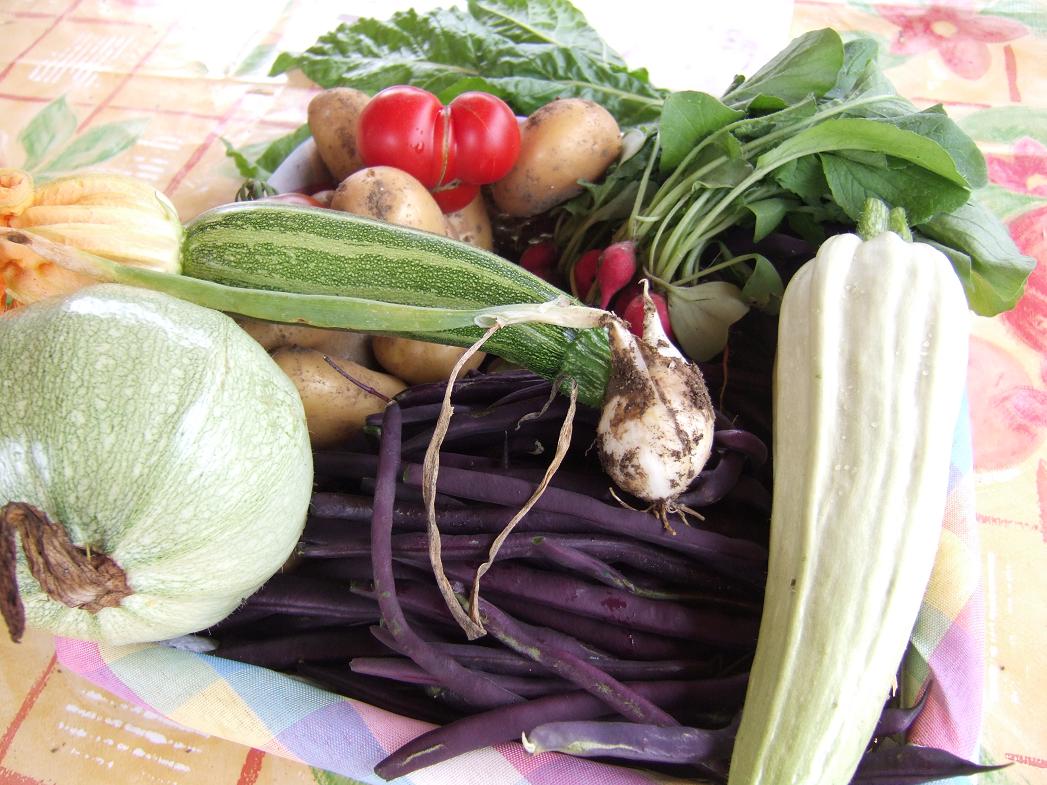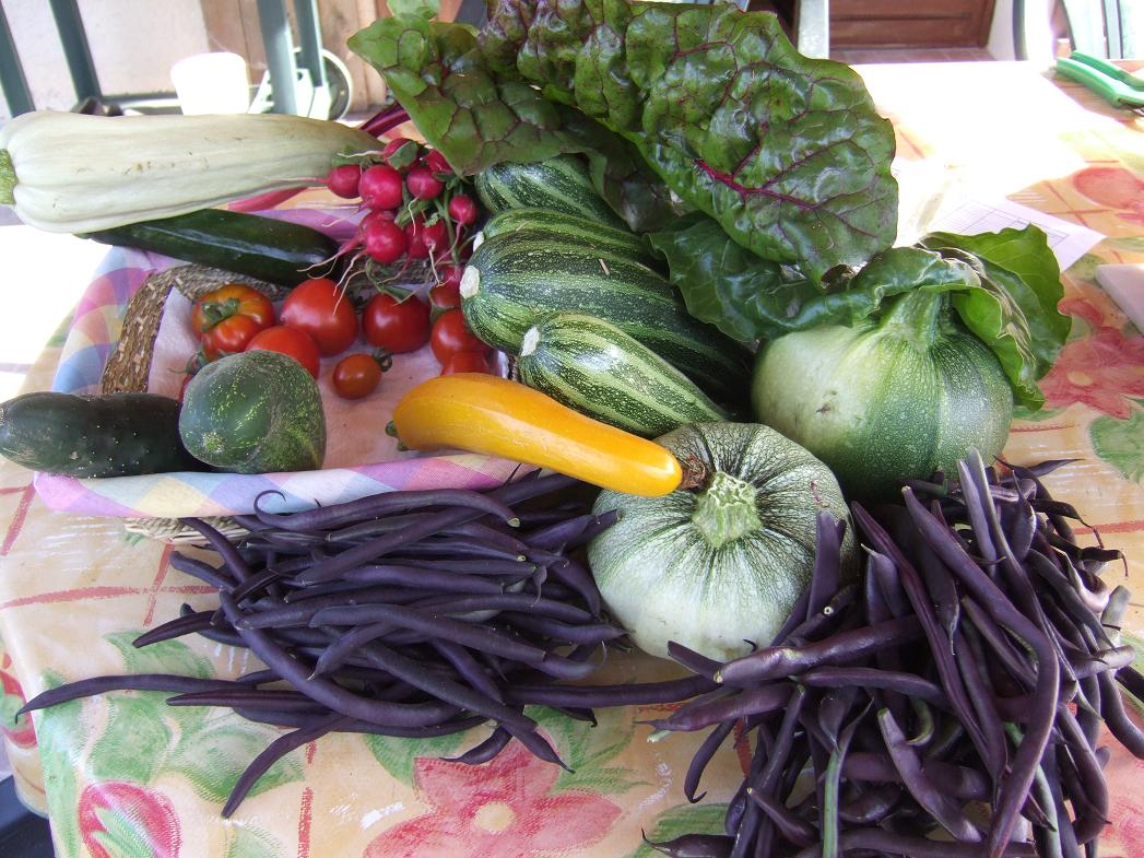 2 petites Tomates, 600g de haricots verts, une courgette verte de milan, une courgette blanche de sicile, une courgette ronde de piacenza, une douzaine de radis, 1,2 kg de pomme de terre (2 pieds), un petit oignon blanc que j'avais oublié de sortir, quelques feuilles d'oseille et de bettes.