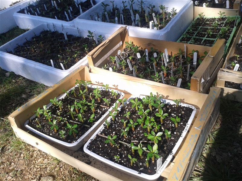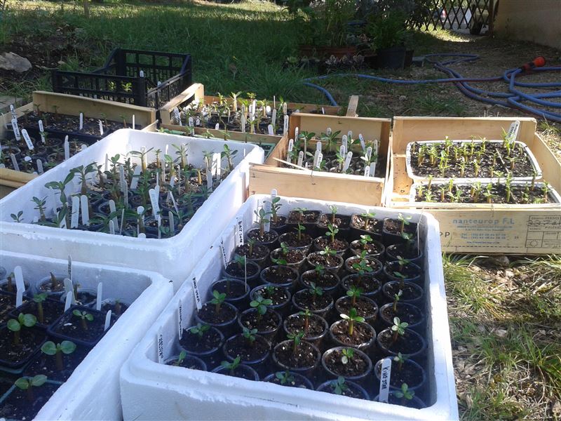 Les derniers semis effectués sont en pots roses. Les autres ont 1.5 an.