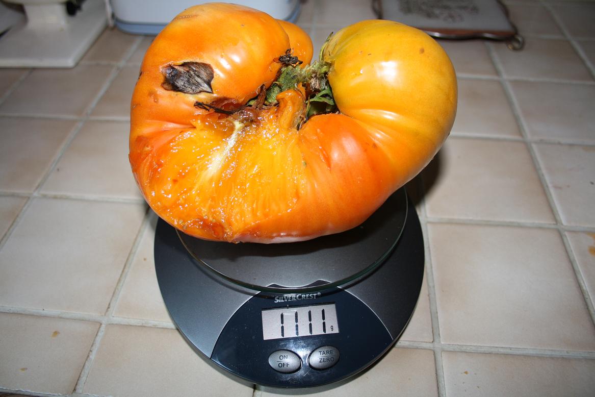 Regarde ce que j'ai cueilli aujourd'hui ? C'est la plus grosse que j'aurais cette année. Elle n'est pas en très grande forme. Elle avait été blessée par la pluie d'orage il y a trois semaine et depuis les guêpes l'attaque sans cesse. De plus comme elle était très lourde elle commençait à peser sur sa voisine qui elle n'est pas encore mure. Donc je l'ai coupé et je vais la cuire.