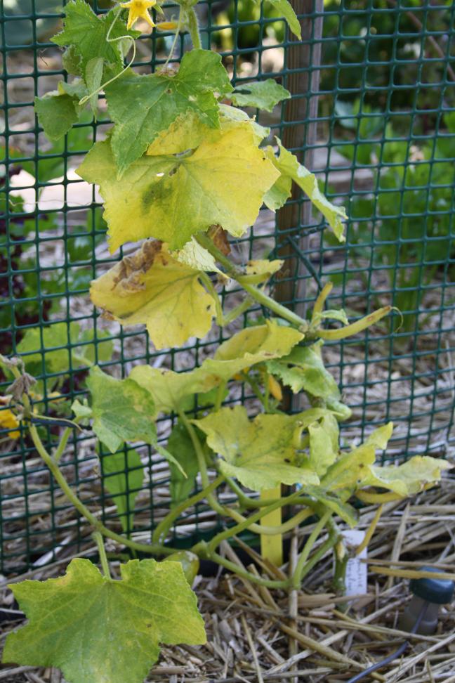 J'ai quelques petits soucis avec un plan de concombre et mon pied d'artichaut. Voici quelques photos.[attachment=1]001.JPG[/attachment]Ce concombre continue à jaunir et je me demande quelle maladie il a pu contracter.