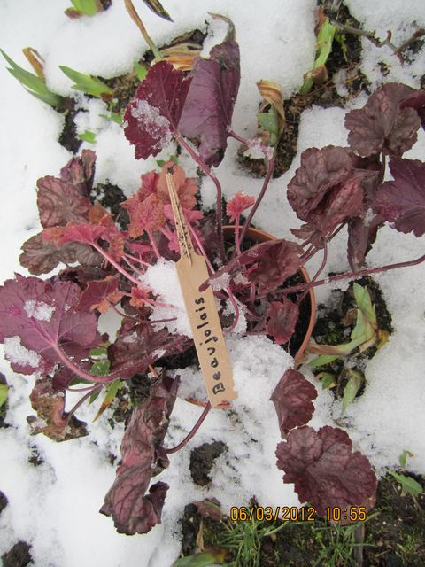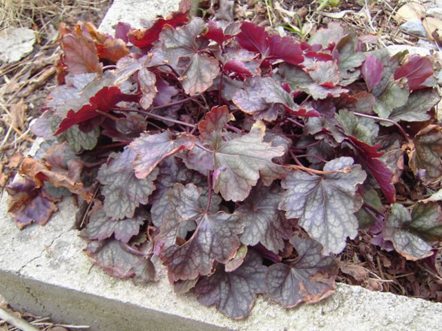 Je ne pense pas que ton heuchère soit une 'Beaujolais', elle trop grise, les feuilles ne font pas pareil, et ce revers pourpre... Et la 'Beaujolais' prend sa belle teinte brune actuellement.
