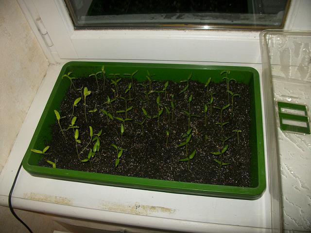 les vraies feuilles ne sont pas là. N'ayant plus l'habitude de semer en bac, je maîtrise mal ce type de germination, et, en observant bien la photo, l'on voit que ça file un peu.. Bien qu'ayant ouvert le couvercle pour raffraichir!Alors demain, muni d'une fine palette et d'un crayon, je repiquerai.