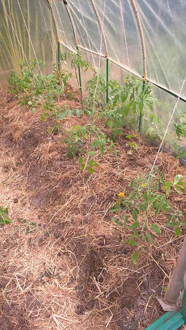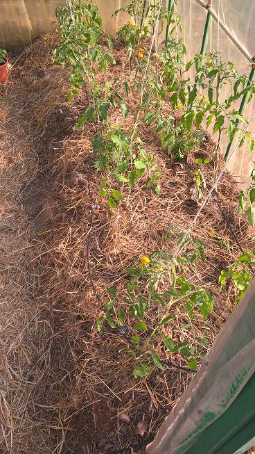 Je suis surprise que tu arrives à mettre 16 pieds de tomates dans une serre de 6m². Je n'arrive à en faire rentrer que 14, en les plaçant tous les 50 cm, y compris au fond. Tu les as mis en quinconce?
