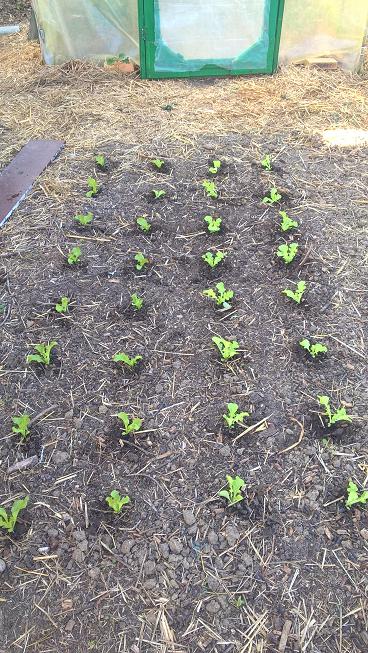 Plantation hier soir de 16 salades rouge grenobloise et de 16 feuilles de chêne blondes,sur un emplacement qui était paillé depuis l'automne par des feuilles mortes,que j'ai ratissé hier matin.