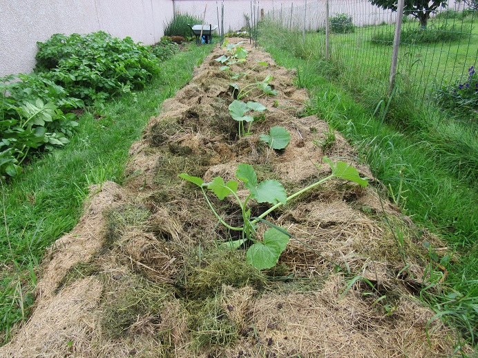 La tas de compost que j'ai monté toute la saison dernière est couvert par des bâches et j'y ai planté 2 pieds de courges et 2 pieds de courgettes pour recouvrir les bâches pendant l'été.