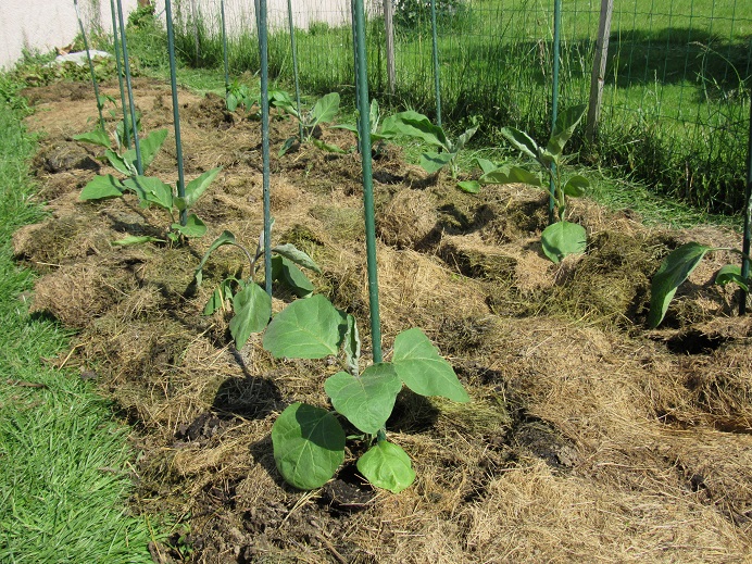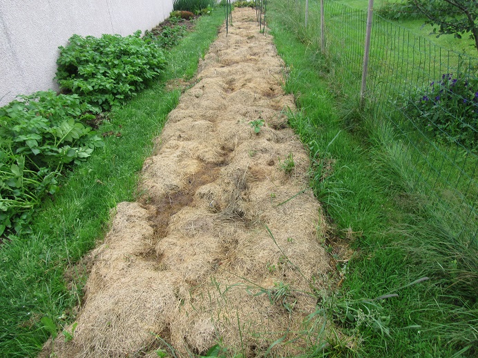 Pour la couverture du sol, je mets des tontes tant que les haricots ne sont pas suffisamment grands, ensuite, ils se chargent eux-mêmes de faire de l'ombre aux herbes qui voudraient pousser