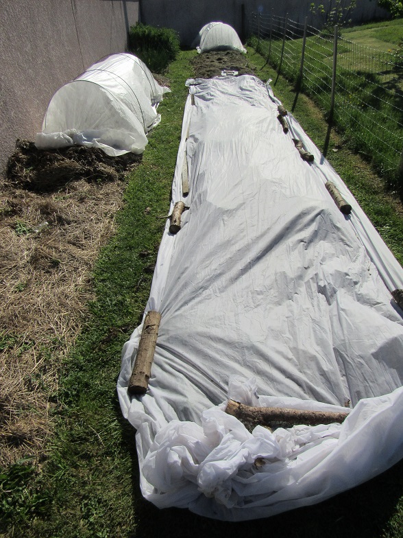 Le jardin avec ces protection. La planche de salades est recouverte par un long P30. Sur la gauche, le mini tunnel qui protège les haricots verts et au fond celui des courgettes.