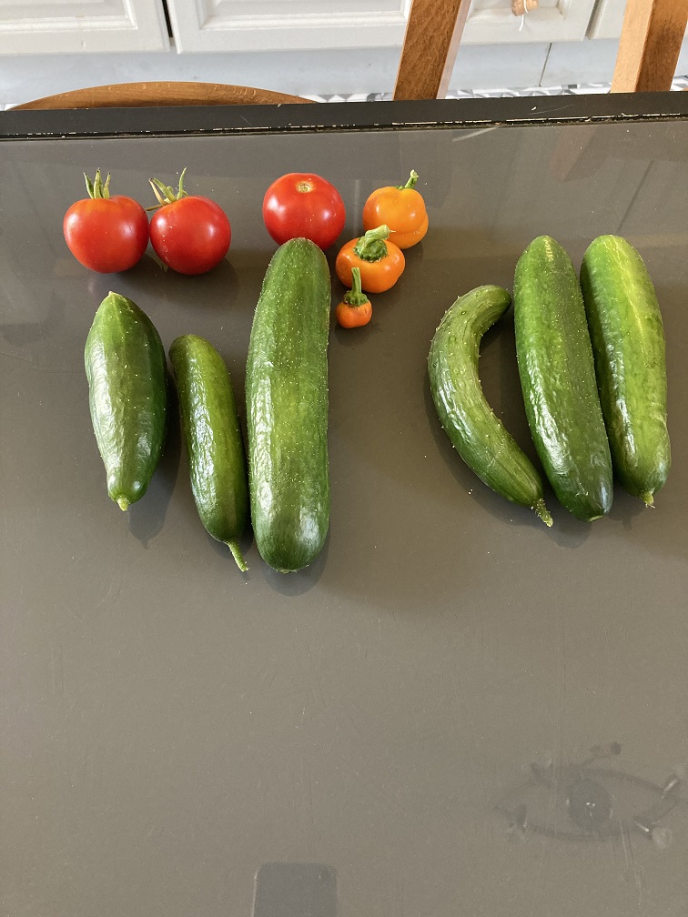 Et comme tous les jours , passage au potager récolte de qq tomates et concombres.