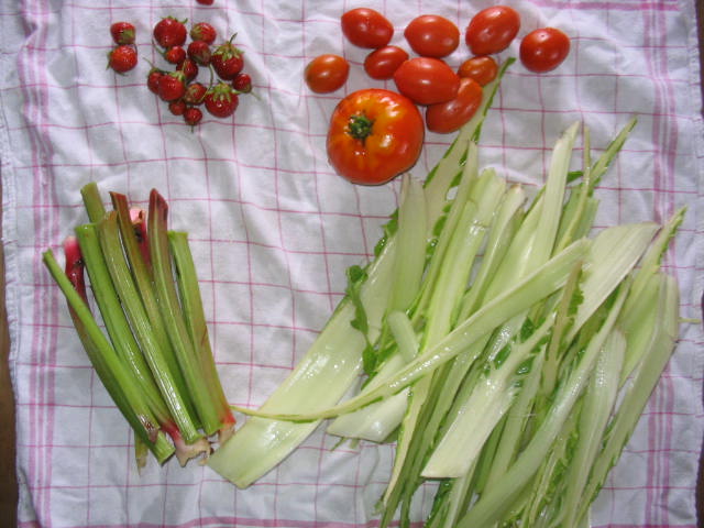 alors voilà la récolte d'avant-hier : rhubarbe, tomates, fraises, bettes...