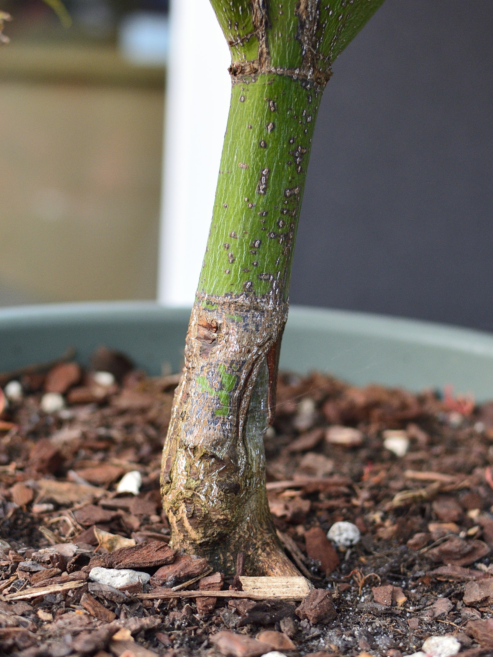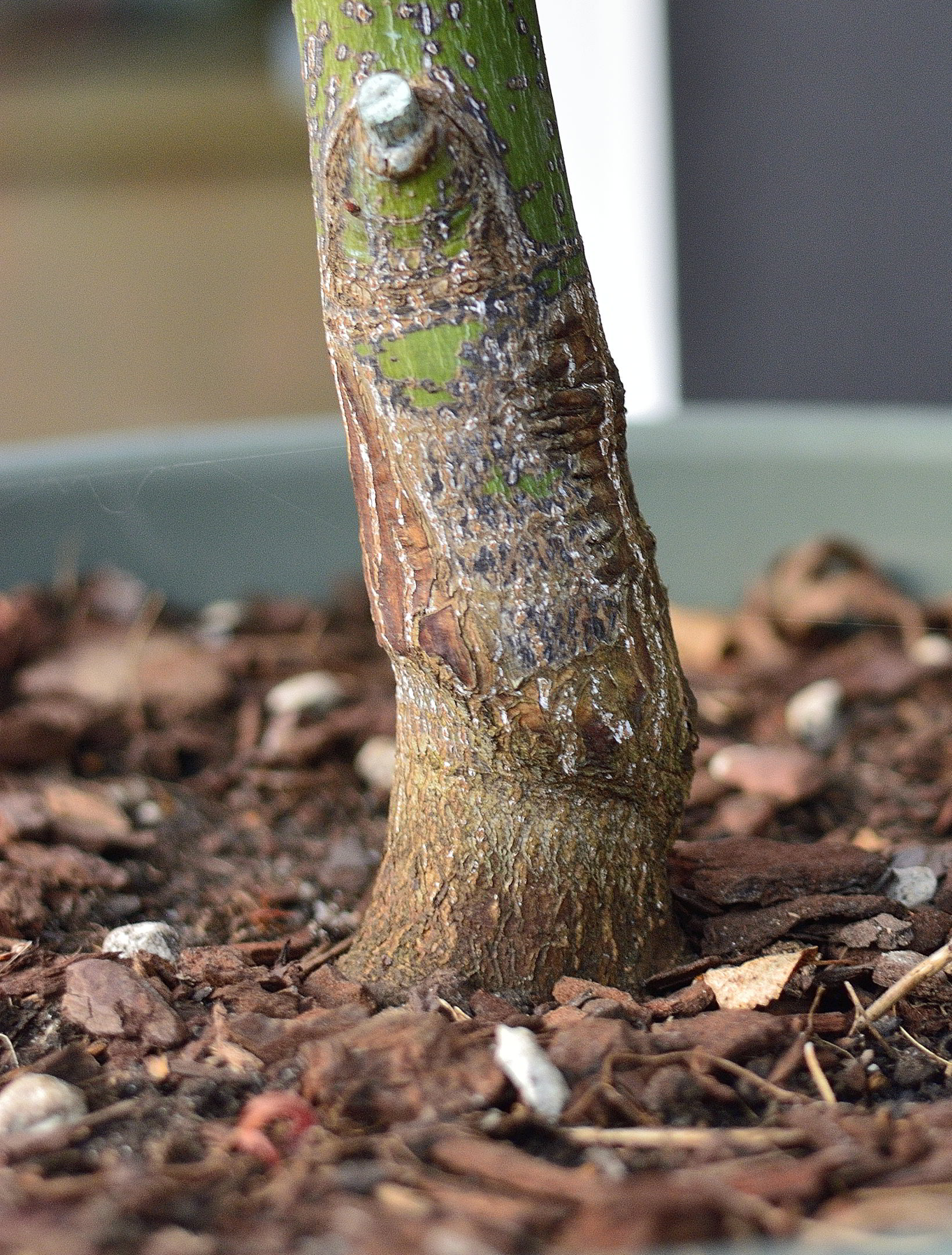 Je l’avais blessé en bas du tronc il y a 1 an avec la tondeuse, mais traité de suite avec du Nordox.