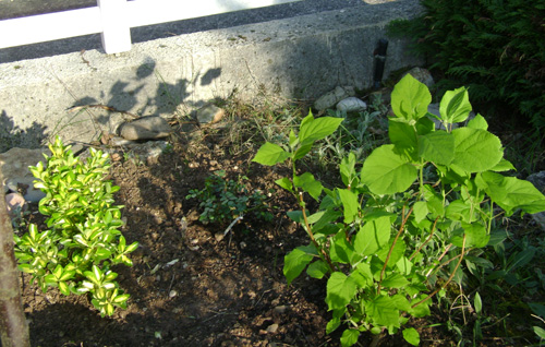 Voici une ch'tit phto de ma nouvelle association (inspirée des votres !) : fusain panaché, rosier Rush et hydrangea Hannabel. Ce sera marrant (ou désastreux, vas savoir...) de voir la différence au mois de juin... Ou dans quelques années !