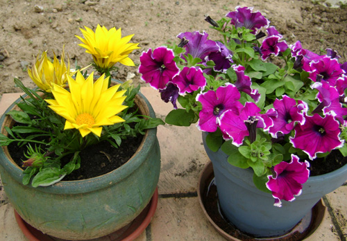 Je suis assez contente de l'association de cette potée... Quand le pétunia aura un peu grossi, ce sera superbe.