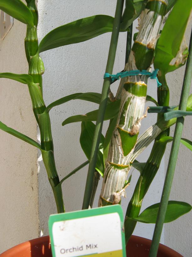 tiens voila une photo du mien de dendro nobile avec une vielle canne devant et sur la gauche une nouvelle canne avec une fleur en preparation