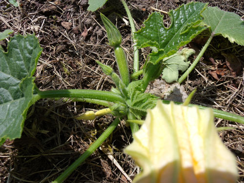Après plusieurs semaines de fleurs mâles presque chaque jour, voici les premières femelles qui pointent leur nez sur les plants de courgette !