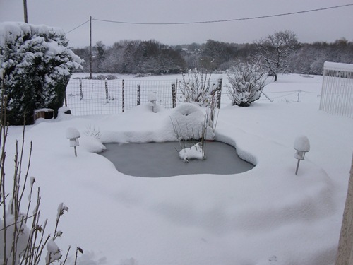 Chez moi pas de neige mais un peu de gel depuis quelques jours, nous avons arrêté la pompe mais ce midi j'ai vu les poissons qui se promenaient dans les herbes au fond :wink: