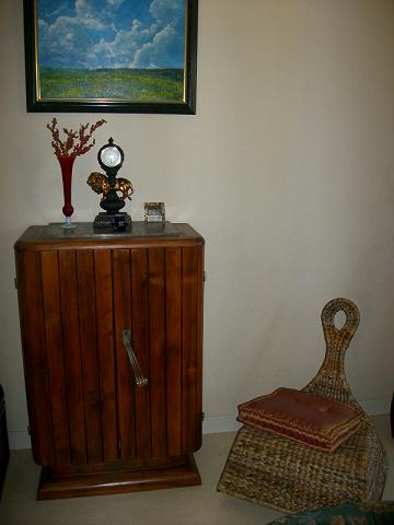 et lorsque l'on regarde le meuble tout de suite à gauche et là il y a, sous le tiroir du milieu ,une trappe coulissante: elle est bloquée. du moins je ne sais pas comment la manoeuvrer