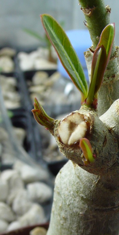 pour la coupe : tu etetes la grande branche comme si tu coupais le goulot d une bouteille ( ca devrait etre a peut pres au niveau des autres ramifications sur ton adenium )