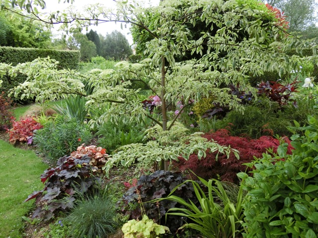Peter Wolonsky créateur de Kerdalo dit : "Cornus controversa variegata vit malheureusement peu de temps", celui que l'on voit actuellement à Kerdalo a été remplacé deux fois, depuis 1965 c'est le troisième sujet.