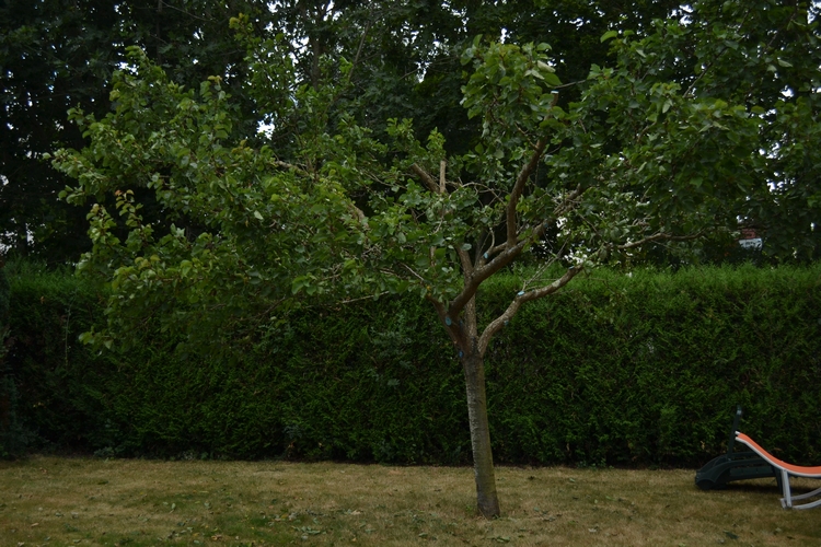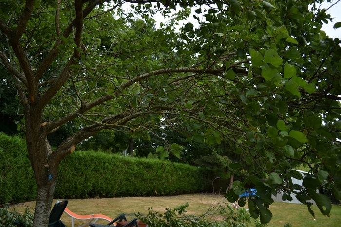 je n'ai pas eu le temps en Juin de tailler mon abricotier mais vu le temps que l'on a eu en ce mois de Juin, il était sans doute préférable de différer la coupe. Je compte m'y mettre très prochainement. Il y a déjà cette branche sans feuille et qui n'en a toujours pas depuis que je vais pouvoir couper mais ensuite, j'attaque par quoi ?