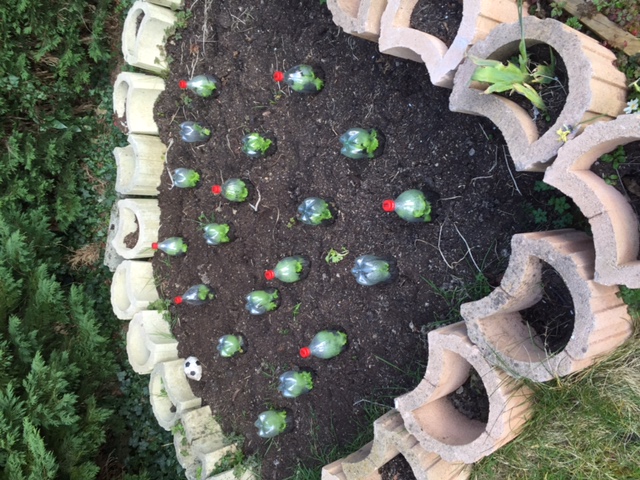 Du coup j'ai tout planté dans un carré tout propre et j'ai "cloché" avec des demi-bouteilles en plastique à l'arrache vu que j'ai -3 d'attendu dans la nuit...