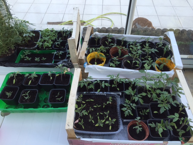 pas beaucoup le temps de potager ces derniers jours mais une belle avancée pour les semis de tomates: visiblement, la véranda leur plait beaucoup!
