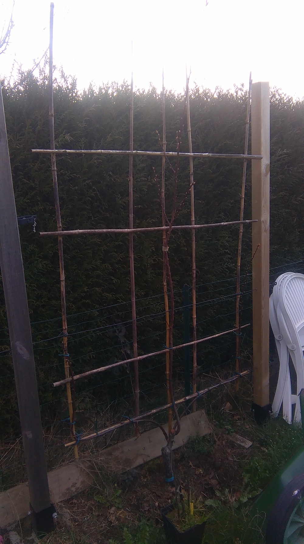 Franchement tu est motivé de t'atteler à former un abricotier sachant que tu a toutes les chances de le perdre chaque printemps vu ton climat. C'est la plupart du temps une grosse galère de les maintenir en vie alors en bretagne le long d'une haie en plus avec une palmette à ras la moquette, humm, si tu y arrives chapeau!