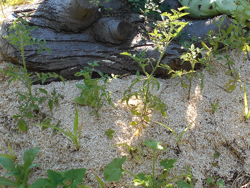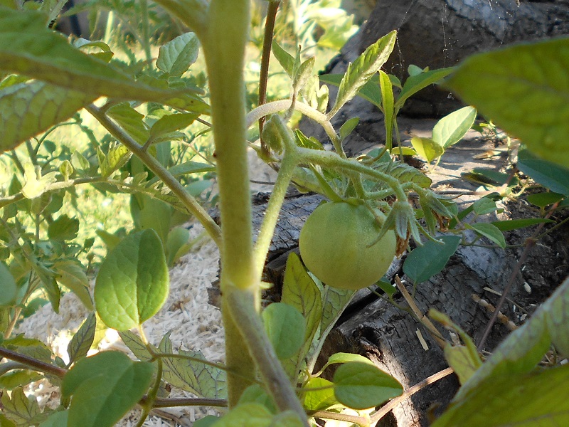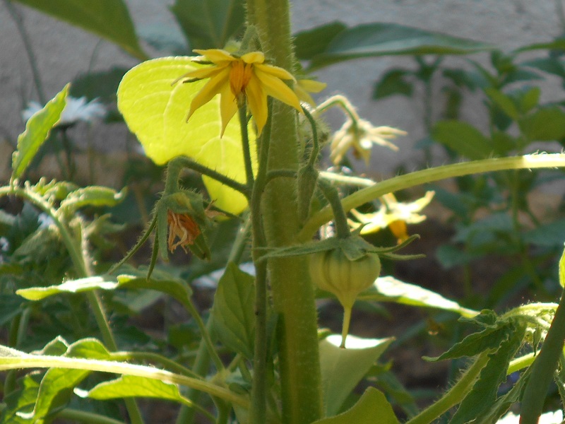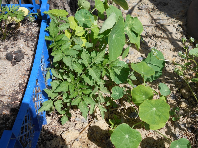 les semis spontanés de tomates cerises et capucines commencent leur floraison.