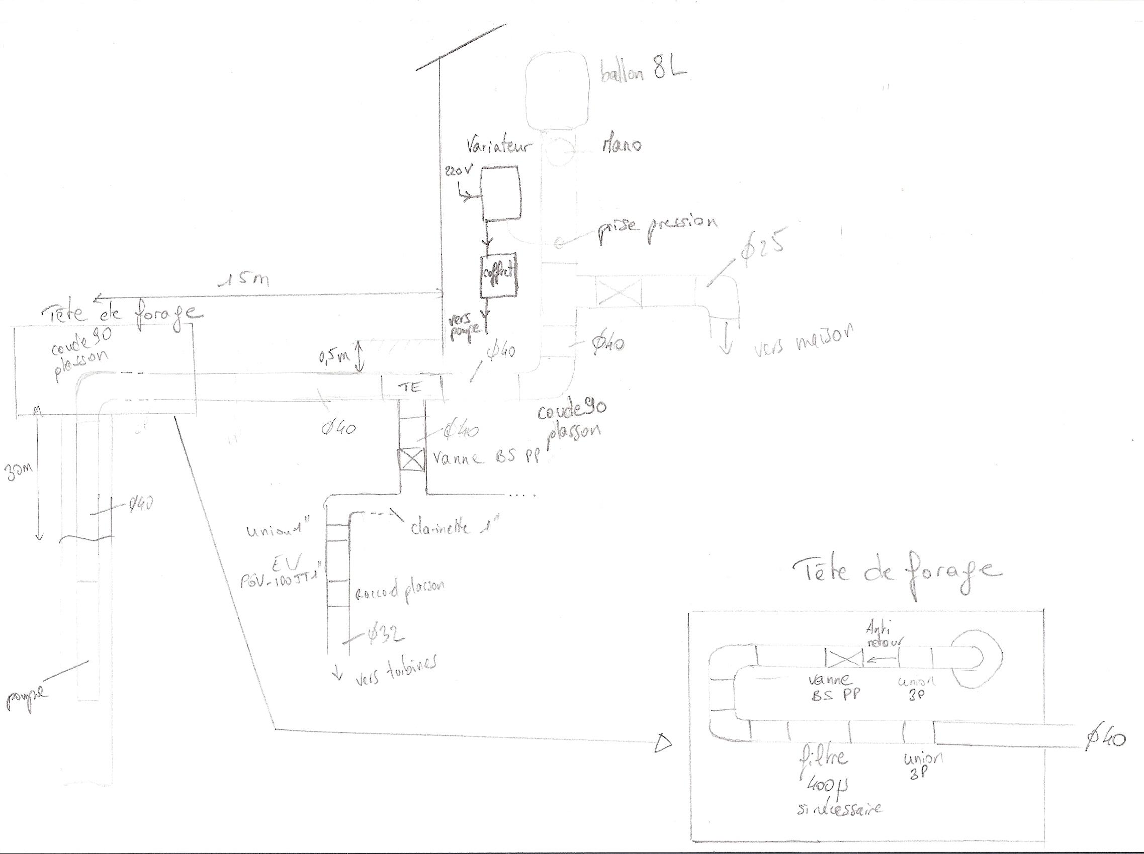 La pompe est en position dans le forage, à 50m. MOn regard est fait en t^te de forage, en ligne droite (je ferai une photo), puisque je n'ai pas mis de filtre pour le moment.