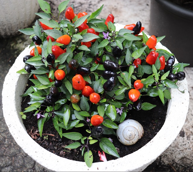 Il y a un piment Numex Halloween dans le pot blanc et un piment olive noir dans l'autre. C'est un mélange de terre, de terreau et de compost. Les plants en godets ont eu un engrais à libération lente. Au cours de la saison, il y a quelques apports d'engrais.