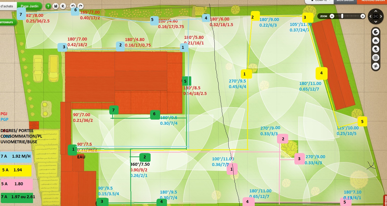 Attention, ça manque cruellement d arroseur mais toute la partie à droite du trait noir et quasi tout le temps à l ombre. Il faudrait y placer des arroseurs normalement et arroser moins souvent mais pour une question de cout , de main d oeuvre et d intérêt moindre je vais laisser comme ça ( puis je dois pouvoir rouler partout en voiture +remorque). Cette partie réseau jaune et rose ne sera réalisé que l an prochain.