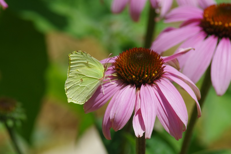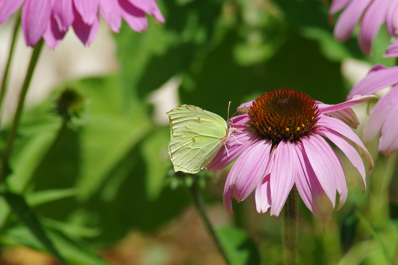 Je pense que c'est Gonepteryx rhamni: le mâle a une couleur jaune uniforme des ailes, tandis que la femelle est reconnaissable à la couleur blanche légèrement verdâtre. Les deux ont un petit point rouge-orange au milieu des ailes et des taches brunes le long de la marge externe. Les ailes sont pointées dans le bord avant et dans la marge inférieure, où il y a une petite queue.