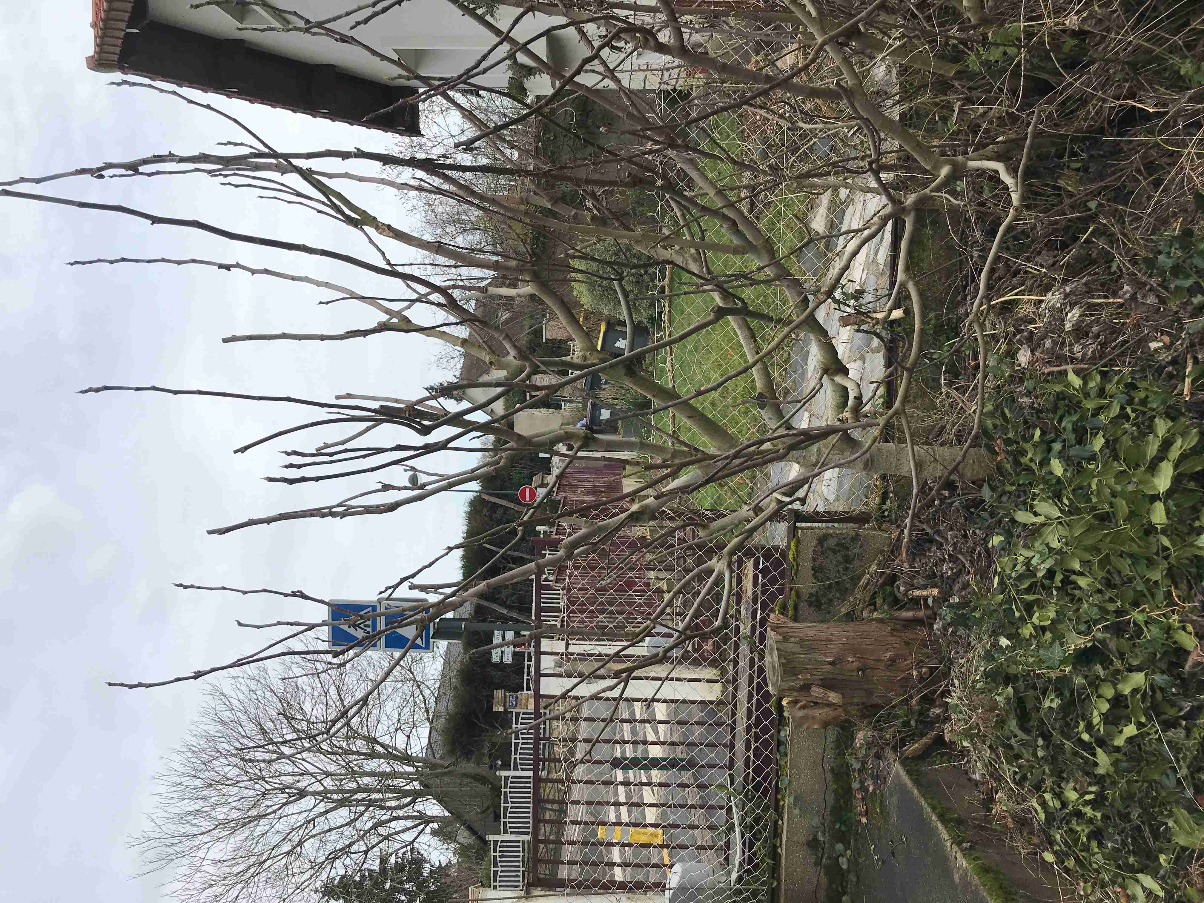 Voici 2 photos, de face et de profil. De profil, il est bien dégarni côté gauche sur la photo, et devra le rester pour ne pas gêner inconsidérément les voisins. Sa plantation proche de la clôture fait également que l'option "pas de taille" en hauteur n'est pas envisageable.