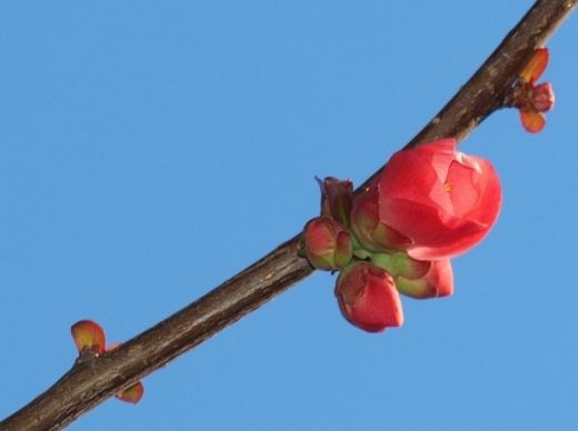 Aujourd'hui, les boutons de Chaenomeles japonica (le cognassier du Japon) s'apprêtent à s'ouvrir,