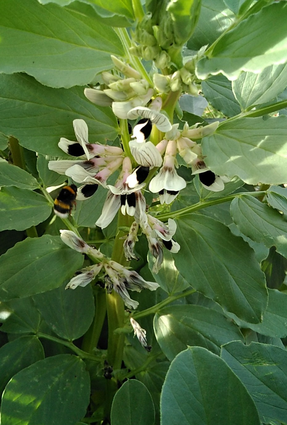 Les fèves sont pleines de fleurs, des pucerons, pas encore de coccinelle mais beaucoup de bourdons Le rectangle général avec les fèves, les salades de mon mari et mes 3 petits pois qui se courrent après...