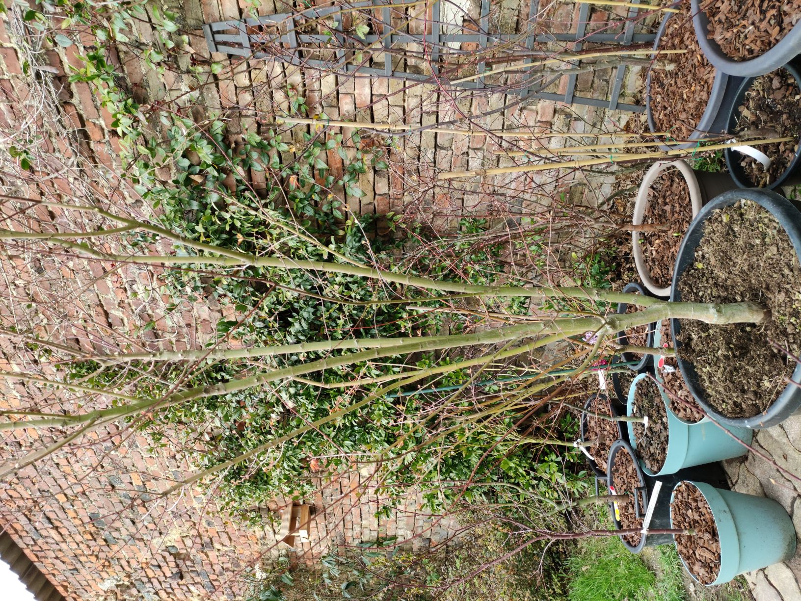 Je présente aujourd'hui mon nouveau 'katsura' (le troisiÚme). Il est arrivé cet aprÚs-midi entre deux averses : encore merci à Cédric qui a su se démener pour me trouver ce spécimen magnifique de presque 3m en container de 90L. Il vient d'Italie et a cette architecture érigée typique de son type (parce qu'il n'a pas été massacré par des tailles inappropriées).